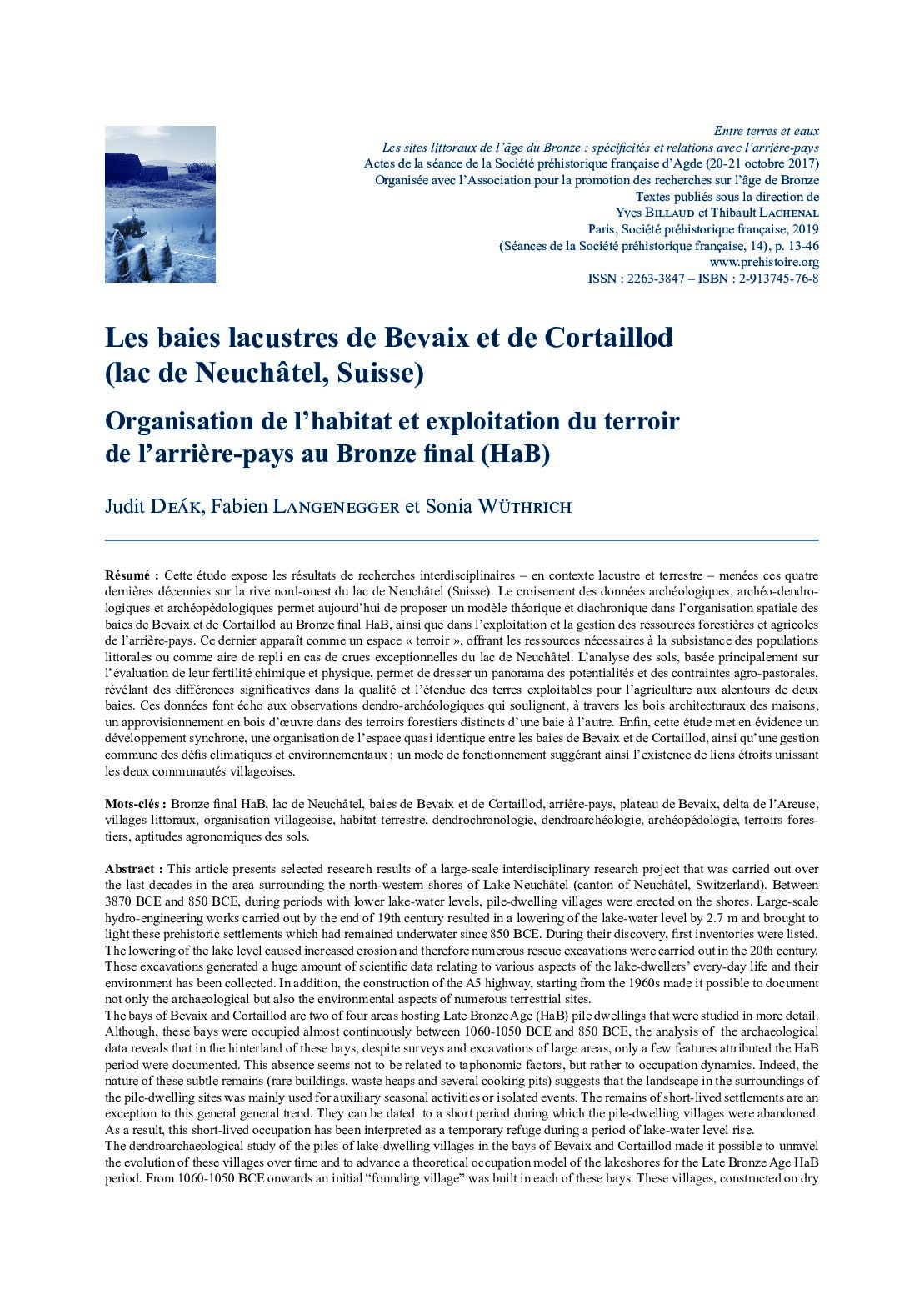 Cette étude expose les résultats de recherches interdisciplinaires – en contexte lacustre et terrestre – menées ces quatre dernières décennies sur la rive nord-ouest du lac de Neuchâtel (Suisse). Le croisement des données archéologiques, archéo-dendro-logiques et archéopédologiques permet aujourd’hui de proposer un modèle théorique et diachronique dans l’organisation spatiale des baies de Bevaix et de Cortaillod au Bronze final HaB, ainsi que dans l’exploitation et la gestion des ressources forestières et agricoles de l’arrière-pays. Ce dernier apparaît comme un espace « terroir », offrant les ressources nécessaires à la subsistance des populations littorales ou comme aire de repli en cas de crues exceptionnelles du lac de Neuchâtel. L’analyse des sols, basée principalement surl’évaluation de leur fertilité chimique et physique, permet de dresser un panorama des potentialités et des contraintes agro-pastorales, révélant des différences significatives dans la qualité et l’étendue des terres exploitables pour l’agriculture aux alentours de deux baies. Ces données font écho aux observations dendro-archéologiques qui soulignent, à travers les bois architecturaux des maisons, un approvisionnement en bois d’œuvre dans des terroirs forestiers distincts d’une baie à l’autre. Enfin, cette étude met en évidence un développement synchrone, une organisation de l’espace quasi identique entre les baies de Bevaix et de Cortaillod, ainsi qu’une gestion commune des défis climatiques et environnementaux ; un mode de fonctionnement suggérant ainsi l’existence de liens étroits unissant les deux communautés villageoises.