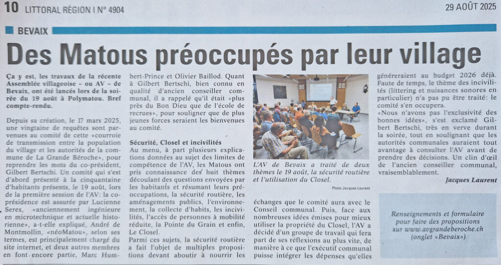 Littoral Région 29 août 2025 André de Montmollin AV Bevaix Le 7 janvier 2026 Organisation: Assemblée Villageoise de Bevaix